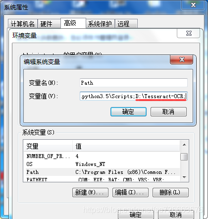 我安装在D:\Tesseract-OCR下,并配置系统环境中点击确认。