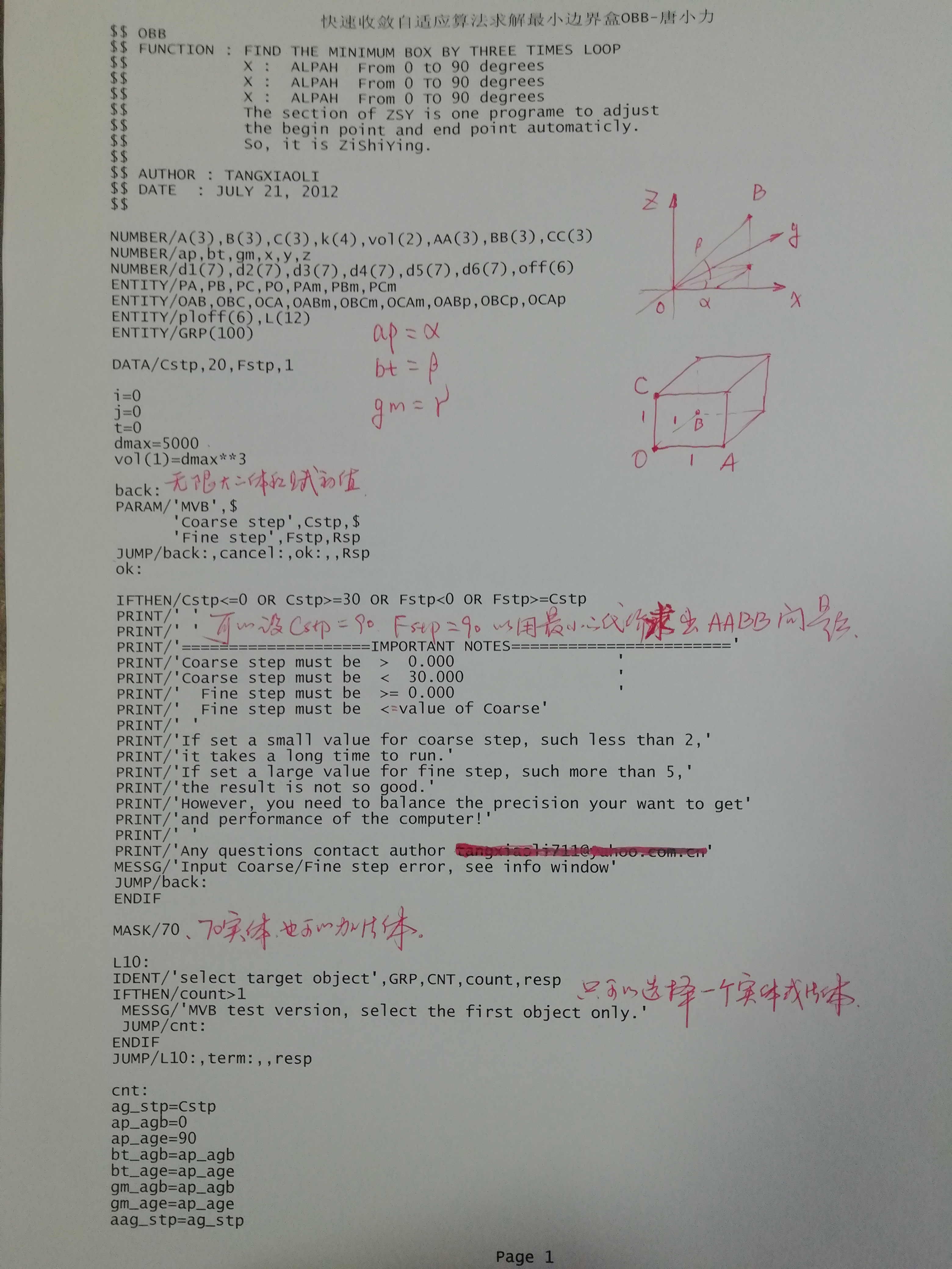 最小包围盒沿坐标轴向包围盒AABB(Axis-Aligned Bounding Boxes)算法简单,适用场合有限。沿任意方向的包围盒OBB(Oriented Bounding Boxes)适用面广,但大多算法效率不高,一方面是模型本身复杂导致,另一方面是精度越高、循环叠代次数沿指数增加而导致。博主几年前提出的一种求解OBB问题的自适应算法,并用UG NX二次开发Grip语言实现了此算法,经过测试,运算效率和精度都十分理想。