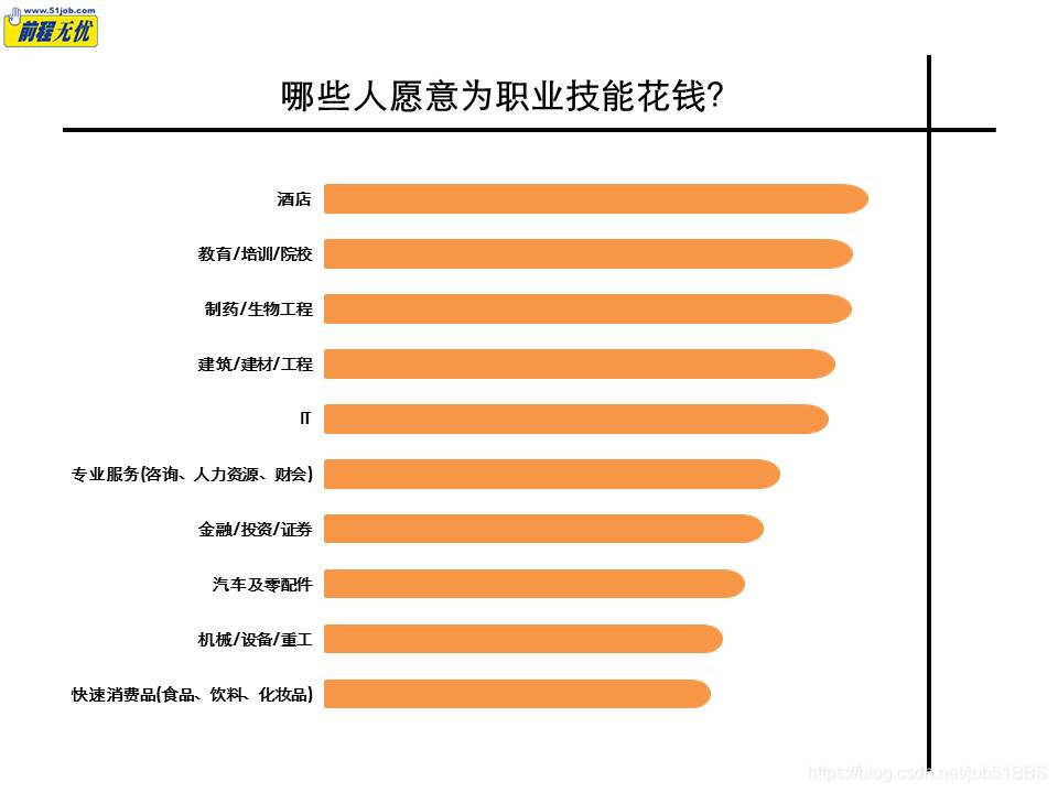 本次调查进一步对于求职前的培训进行了分类,分析数据后发现,有55%的人表示愿意把钱花在培训职业技能上,以提高自己的竞争力。图1为最愿意在职业技能上花钱的十大行业排名。