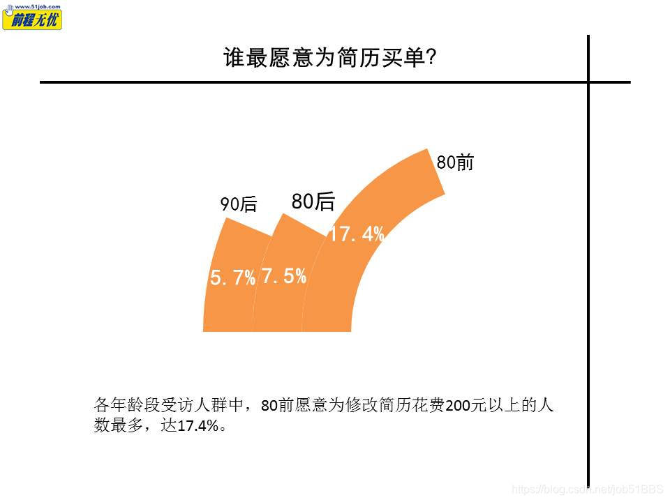 讨论完时间成本,我们再来看看金钱投入。调查显示,在各年龄段受访人群中,80前更愿意为制作修改简历买单。具体见图3。