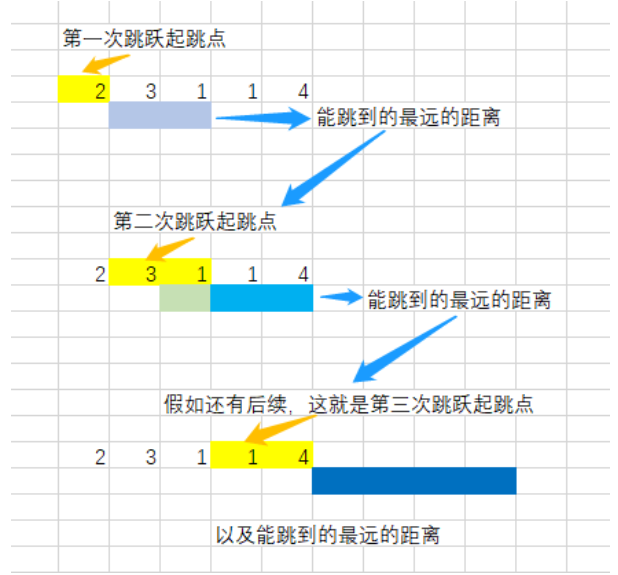 public:int jump(vector<int>& nums) {//基本思想:贪心法,这是一道典型的贪心算法题int i, max_pos = 0, step = 0, reach = 0;i = 0;//对每个跳点i都计算当前前i个跳点最大可以跳到的点max_pos,如果当前跳点i触及到前一个最大跳点处,说明必须得跳一步step++,当前最大触及点更新为当前最大跳while (i < nums.size() - 1){//计算当前前i个跳点最大可以跳到的点max_posmax_pos = max(max_pos, nusm[i] + i);//如果最大跳可以跳到终点,结束返回step+1if (max_pos >= nums.size() - 1)return step + 1;//当前跳点i触及到前一个最大跳点处,说明必须得跳一步step++,当前最大触及点更新为当前最大跳if (i == reach){step++;reach = max_pos;}i++;}return step;}