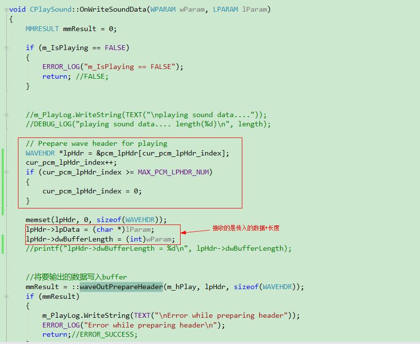 {MMRESULT mmResult = 0;if (m_IsPlaying == FALSE){ERROR_LOG("m_IsPlaying == FALSE");return; //FALSE;}//m_PlayLog.WriteString(TEXT("\nplaying sound data...."));//DEBUG_LOG("playing sound data.... length(%d)\n", length);// Prepare wave header for playing WAVEHDR *lpHdr = &pcm_lpHdr[cur_pcm_lpHdr_index];cur_pcm_lpHdr_index++;if (cur_pcm_lpHdr_index >= MAX_PCM_LPHDR_NUM){cur_pcm_lpHdr_index = 0;}memset(lpHdr, 0, sizeof(WAVEHDR));lpHdr->lpData = (char *)lParam;lpHdr->dwBufferLength = (int)wParam;//printf("lpHdr->dwBufferLength = %d\n", lpHdr->dwBufferLength);//将要输出的数据写入buffermmResult = ::waveOutPrepareHeader(m_hPlay, lpHdr, sizeof(WAVEHDR));if (mmResult){m_PlayLog.WriteString(TEXT("\nError while preparing header"));ERROR_LOG("Error while preparing header\n");return;//ERROR_SUCCESS;}//将输出数据发送给输出设备mmResult = ::waveOutWrite(m_hPlay, lpHdr, sizeof(WAVEHDR));if (mmResult){ERROR_LOG("Error while writing to device");m_PlayLog.WriteString(TEXT("\nError while writing to device"));return;//ERROR_SUCCESS; }return;//ERROR_SUCCESS;