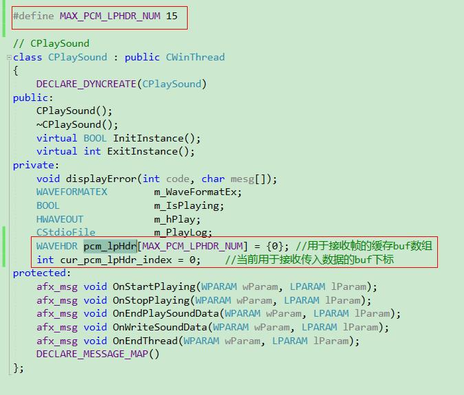 private:void displayError(int code, char mesg[]);WAVEFORMATEX m_WaveFormatEx;BOOL m_IsPlaying;HWAVEOUT m_hPlay;CStdioFile m_PlayLog;WAVEHDR pcm_lpHdr[MAX_PCM_LPHDR_NUM] = {0}; //用于接收帧的缓存buf数组int cur_pcm_lpHdr_index = 0; //当前用于接收传入数据的buf下标