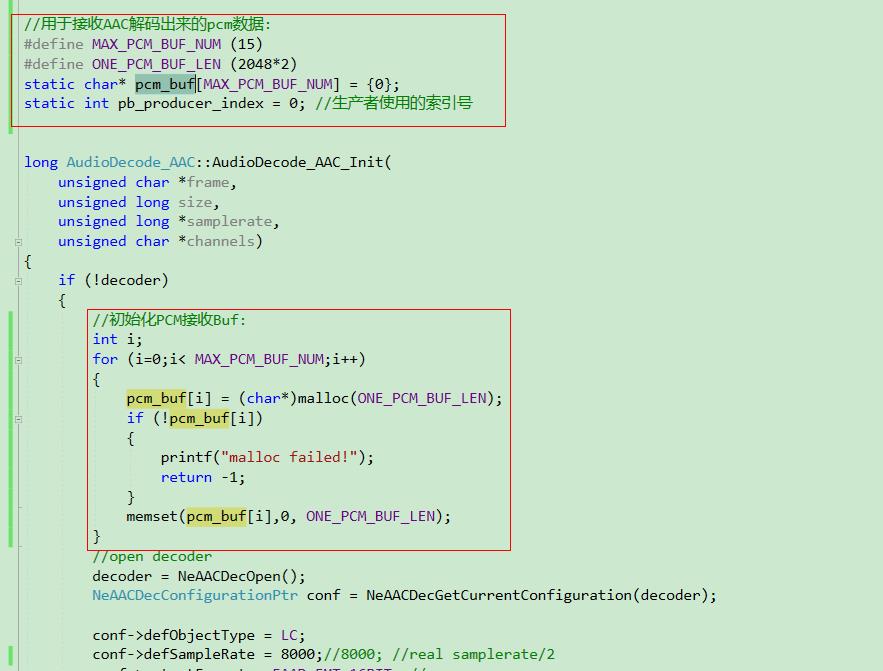 {if (!decoder){//初始化PCM接收Buf:int i;for (i=0;i< MAX_PCM_BUF_NUM;i++){pcm_buf[i] = (char*)malloc(ONE_PCM_BUF_LEN);if (!pcm_buf[i]){printf("malloc failed!");return -1;}memset(pcm_buf[i],0, ONE_PCM_BUF_LEN);}//open decoderdecoder = NeAACDecOpen();NeAACDecConfigurationPtr conf = NeAACDecGetCurrentConfiguration(decoder);conf->defObjectType = LC;conf->defSampleRate = 8000;//8000; //real samplerate/2conf->outputFormat = FAAD_FMT_16BIT; //conf->downMatrix = 0; //不进行自动扩展到双通道 ???conf->useOldADTSFormat = 0; //ADTS长度为0:56bit(1代表是58bit)conf->dontUpSampleImplicitSBR = 1;NeAACDecSetConfiguration(decoder, conf);//initialize decoderreturn NeAACDecInit(decoder, frame,size, samplerate, channels);}else{ERROR_LOG("AAC decoder already inited!\n");return -1;}}int AudioDecode_AAC::AudioDecode_AAC_Exit()