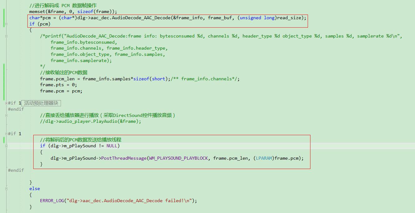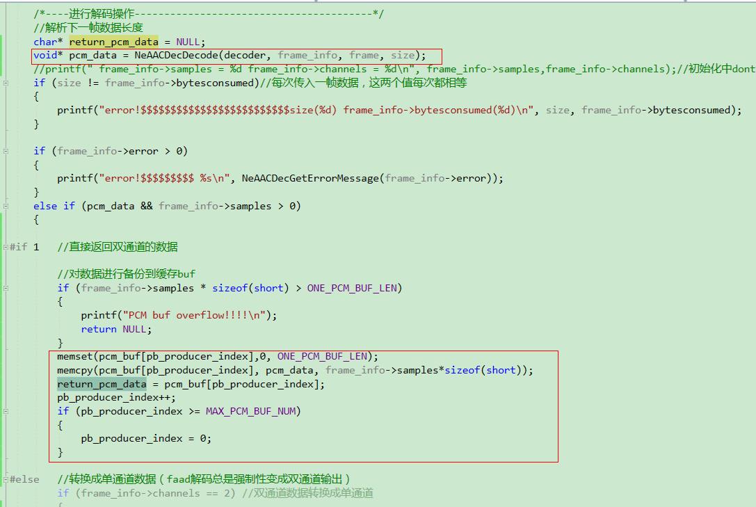 {check_ADTS_len(frame,size);/*----进行解码操作----------------------------------------*///解析下一帧数据长度char* return_pcm_data = NULL;void* pcm_data = NeAACDecDecode(decoder, frame_info, frame, size);//printf(" frame_info->samples = %d frame_info->channels = %d\n", frame_info->samples,frame_info->channels);//初始化中dontUpSampleImplicitSBR = 1时返回2048;dontUpSampleImplicitSBR=0时返回4096if (size != frame_info->bytesconsumed)//每次传入一帧数据,这两个值每次都相等{printf("error!$$$$$$$$$$$$$$$$$$$$$$$$$size(%d) frame_info->bytesconsumed(%d)\n", size, frame_info->bytesconsumed);}if (frame_info->error > 0){printf("error!$$$$$$$$$ %s\n", NeAACDecGetErrorMessage(frame_info->error));}else if (pcm_data && frame_info->samples > 0){#if 1 //直接返回双通道的数据//对数据进行备份到缓存bufif (frame_info->samples * sizeof(short) > ONE_PCM_BUF_LEN){printf("PCM buf overflow!!!!\n");return NULL;}memset(pcm_buf[pb_producer_index],0, ONE_PCM_BUF_LEN);memcpy(pcm_buf[pb_producer_index], pcm_data, frame_info->samples*sizeof(short));return_pcm_data = pcm_buf[pb_producer_index];pb_producer_index++;if (pb_producer_index >= MAX_PCM_BUF_NUM){pb_producer_index = 0;}#else //转换成单通道数据(faad解码总是强制性变成双通道输出)if (frame_info->channels == 2) //双通道数据转换成单通道{if (frame_info->samples/2 * sizeof(short) > ONE_PCM_BUF_LEN){printf("PCM buf overflow!!!!\n");return NULL;}memset(pcm_buf[pb_producer_index], 0, ONE_PCM_BUF_LEN);return_pcm_data = pcm_buf[pb_producer_index];pb_producer_index++;if (pb_producer_index >= MAX_PCM_BUF_NUM){pb_producer_index = 0;}//从双声道的数据中提取单通道 int i, j;for (i = 0, j = 0; i < 4096 && j < 2048; i += 4, j += 2){//每次拷贝2字节数据到frame_mono(16bit位宽,即每个通道数据一个采样2字节)return_pcm_data[j] = ((char*)pcm_data)[i];return_pcm_data[j + 1] = ((char*)pcm_data)[i + 1];}frame_info->samples = frame_info->samples/2;//1024; //只留下单通道数据frame_info->channels = 1;}#endif return (void*)return_pcm_data;}return NULL;