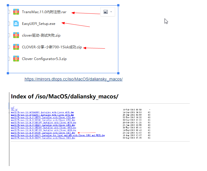 - 下载U盘制作工具transmac,MacOS 10.14.6 系统镜像,clover驱动引导,uefi启动项修改工具。
