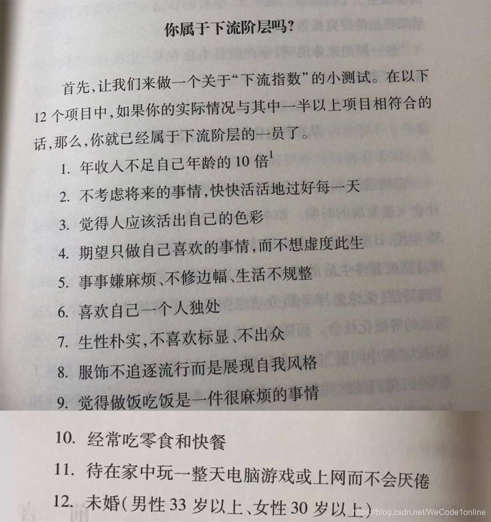 我和朋友的第一个反应都是:不是我!我不是下流阶层!我们年薪那么高,当然是中产!可……没想到,除了第1条,其余的11条全部命中。