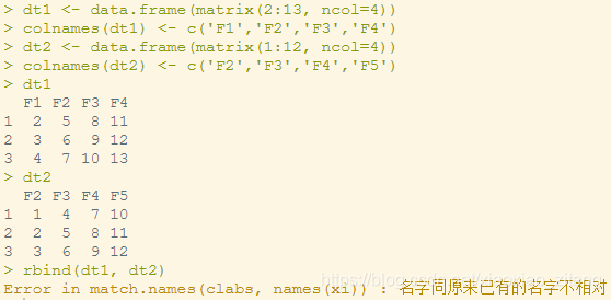 比如,如下定义了两个data.frame,dt1,dt2,存在不相对的列名,则会报错: