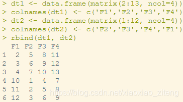 此时,如果将dt2的colnames中的F5改为F1,即与dt1列名一样但是列顺序不同,再进行rbind()操作: