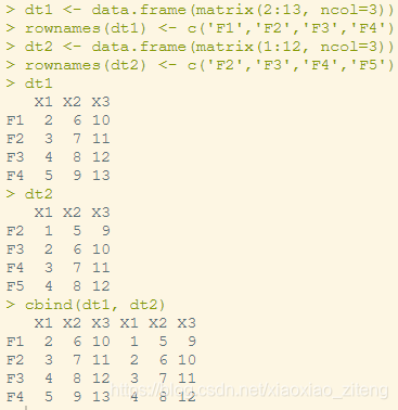 同样定义两个data.frame,dt1,dt2,设置不相对的行名,进行cbind()操作: