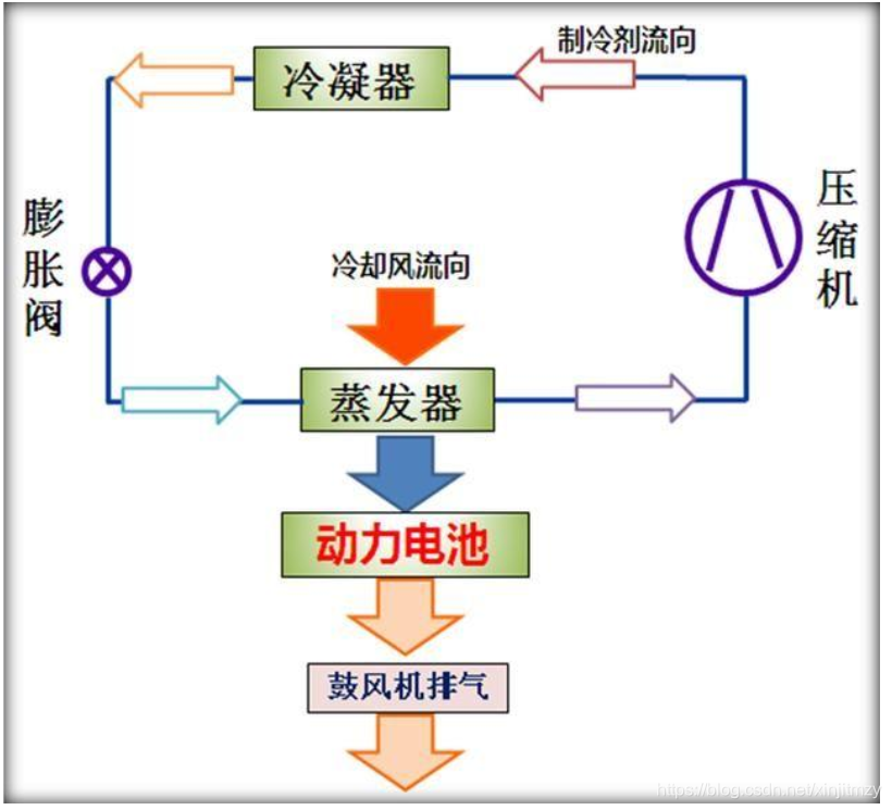 风冷的典型代表是日产聆风Leaf:采用鼓风机(专门为动力电池冷却用)驱动空气通过空调制冷系统的蒸发器后变成冷风,再去冷却动力电池。目前该技术已经比较成熟,由于空气的比热较小,带走的热量较少,主要适用于动力电池散热量较小的情况。一般针对续航里程较短、整车重量较轻的情况。