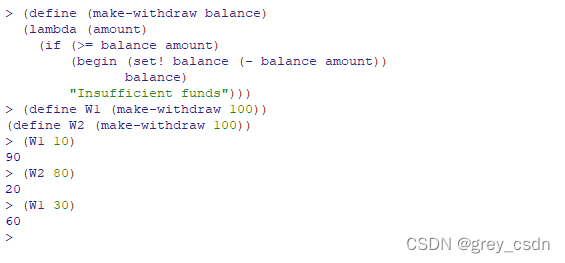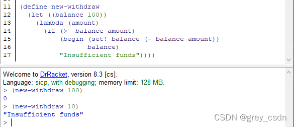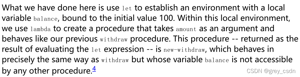 - let定义的其实是一个局部量,但是如果理解正确,new-withdraw是后面的代码段的一个对等表达那么会不会出现变量覆盖的问题?如果不出现,结合之前C语言理解,这里实现的应该是一个类似静态局部变量的效果。而且,在lisp的表达之中let可以执行多次。