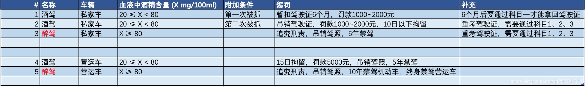 | # | 罪名 | 酒精含量 | 附加条件 | 惩罚 |