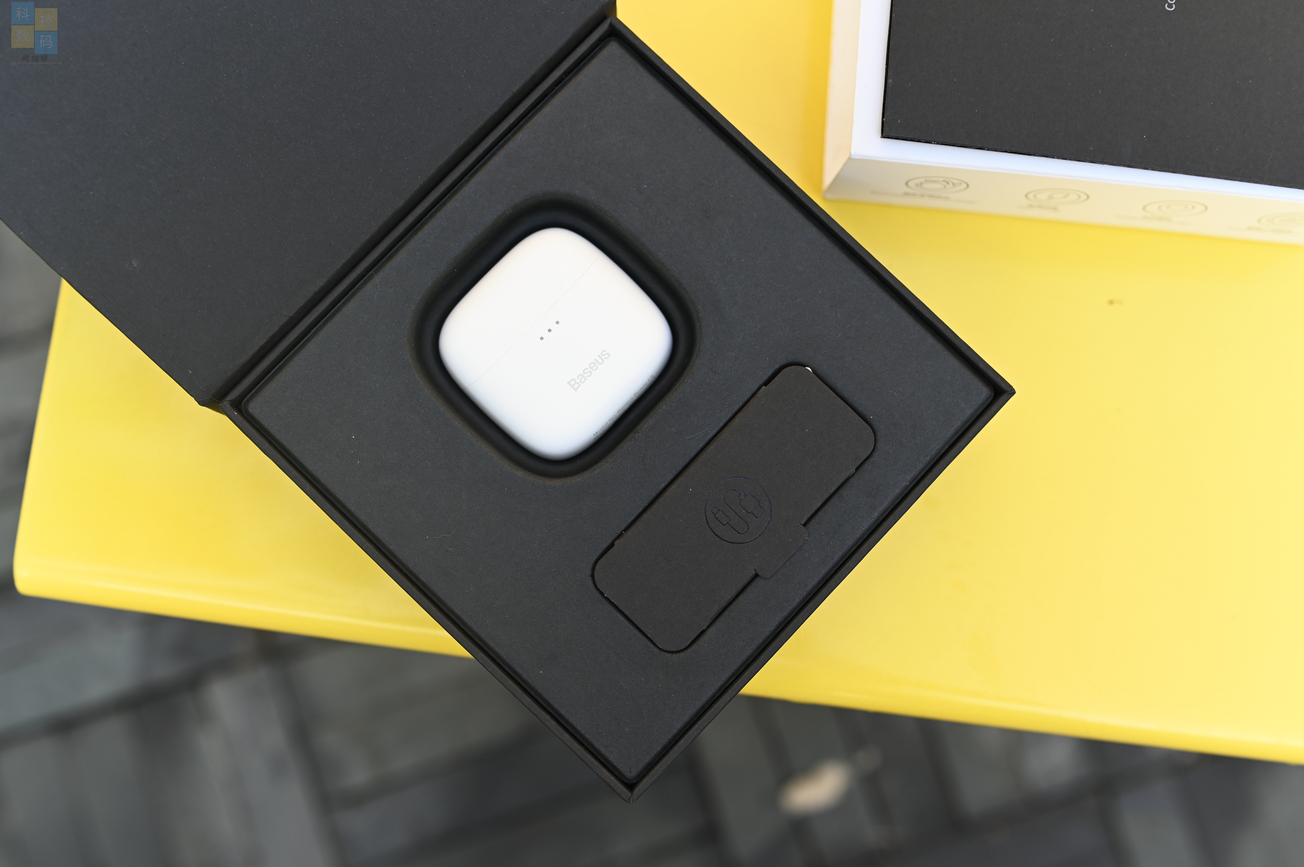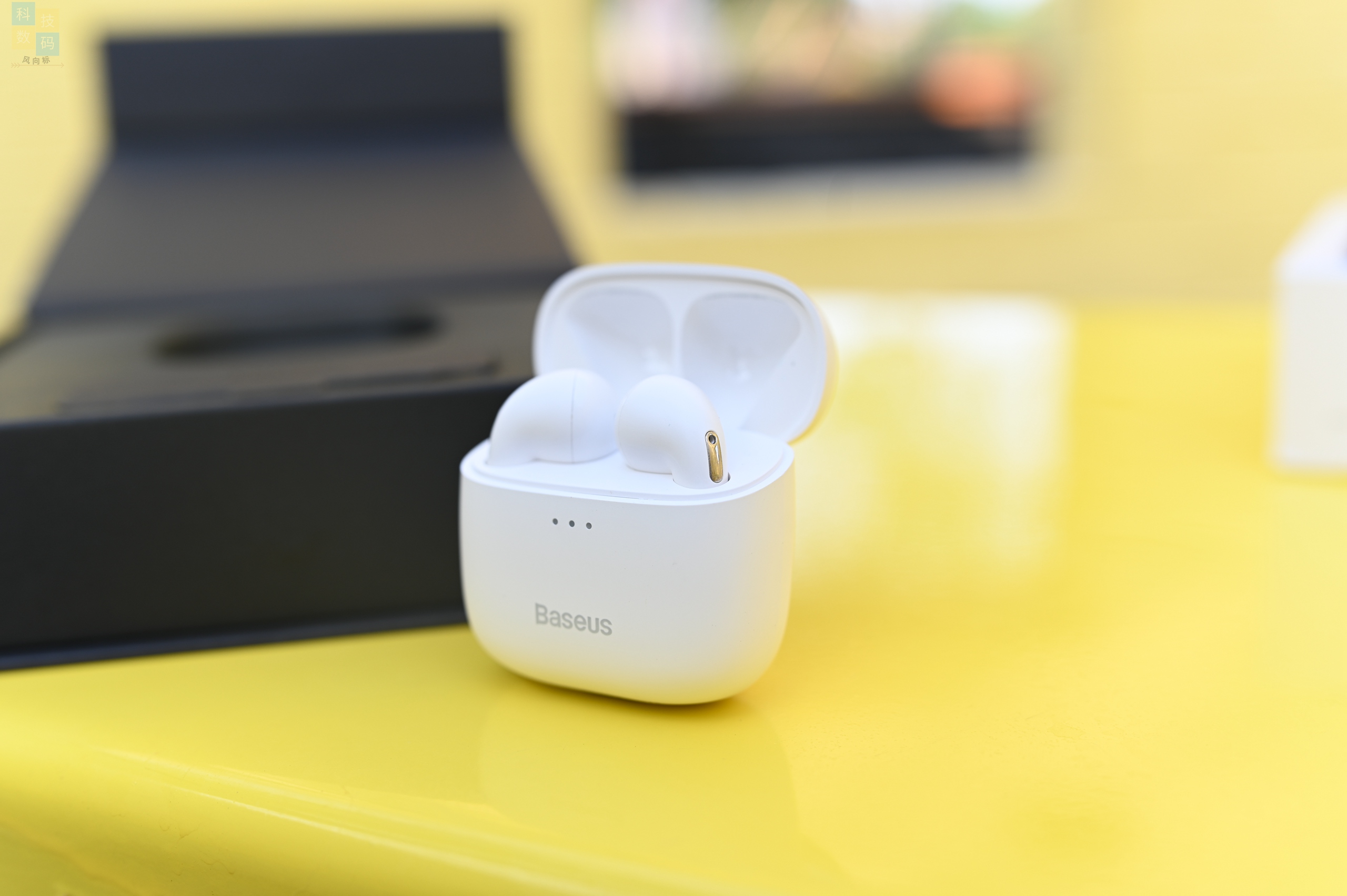 很多真无线耳机的充电仓都采用了磁吸式开合的设计,并且具有霍尔开关的特性,倍思Bowie E8也不例外,这款耳机也支持开盖即连,打开之后可以从充电仓上面的LED灯看到当前的电量,耳机本身能够自动和之前配对的手机连接上。另外可以注意到,充电仓打开后是个斜面,更便于取出耳机。