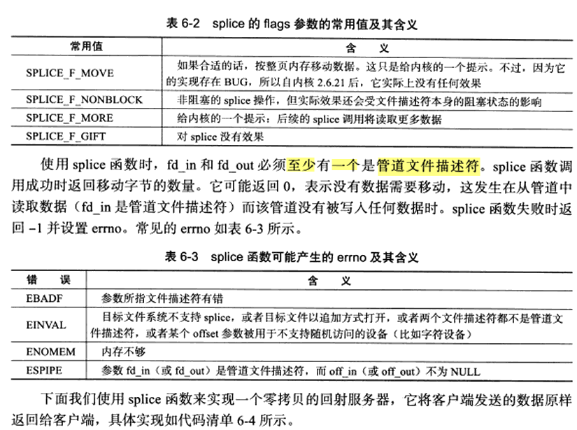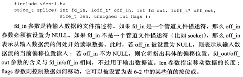 splice函数用于在2个文件描述符之间移动数据,也是零拷贝。定义如下: