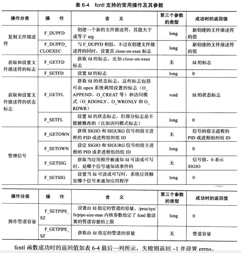 正如其名字(file control)描述那样,提供了对文件描述符的各种控制操作。另一个常见的控制文件描述符属性和行为的系统调用是ioctl,而且ioctl比fcntl能够执行更多的控制。但是对于控制文件描述符常用的属性和行为,fcntl函数是由POSIX规范指定的首选方法。定义如下: