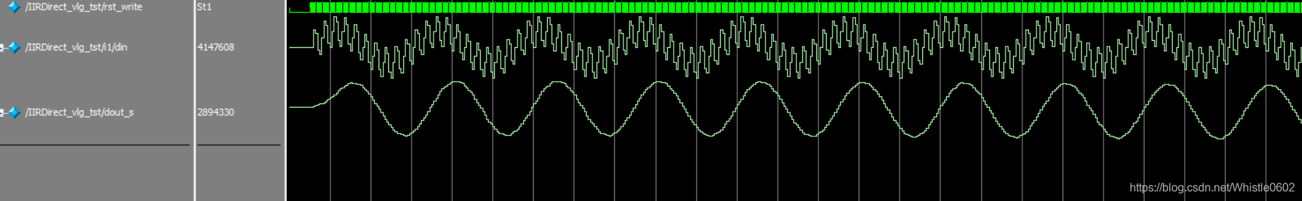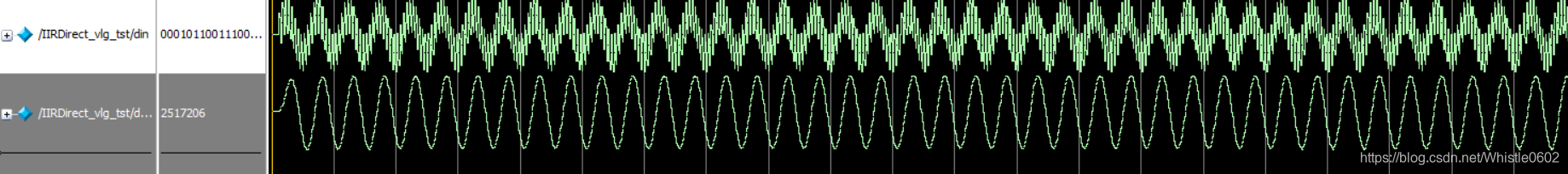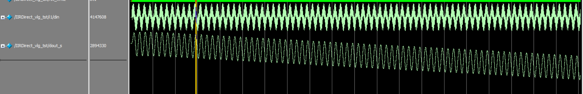 最近用FPGA实现一个带通IIR滤波器,采用matlab的fdatool设计得到滤波器的系数,然后根据杜勇的《数字滤波器的matlab与FPGA实现》中介绍的方法进行零点和极点系数量化,采用的结构是直接I型IIR滤波器。刚开始用modelsim进行的功能仿真得到的结果是这样的。