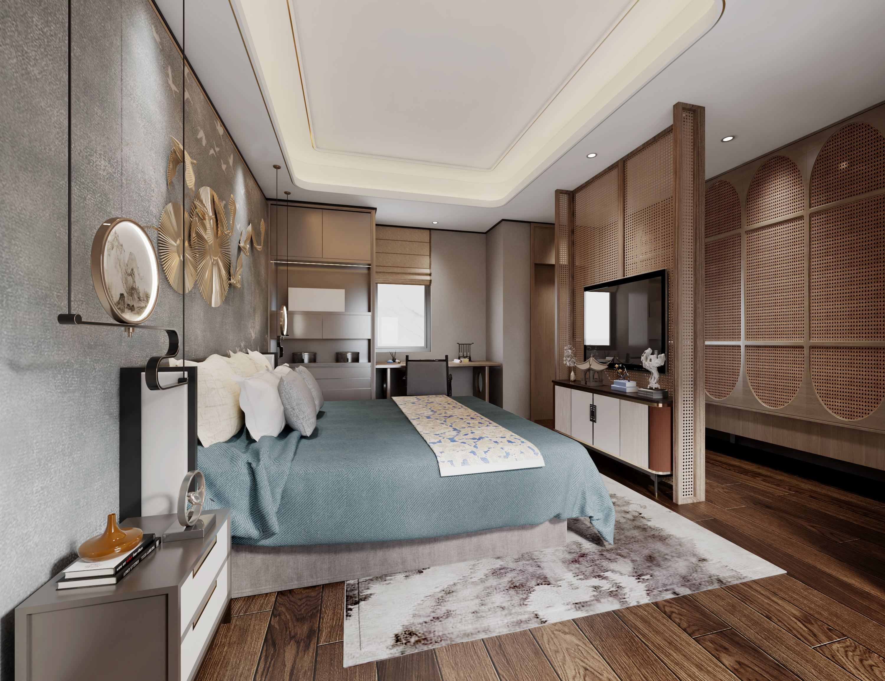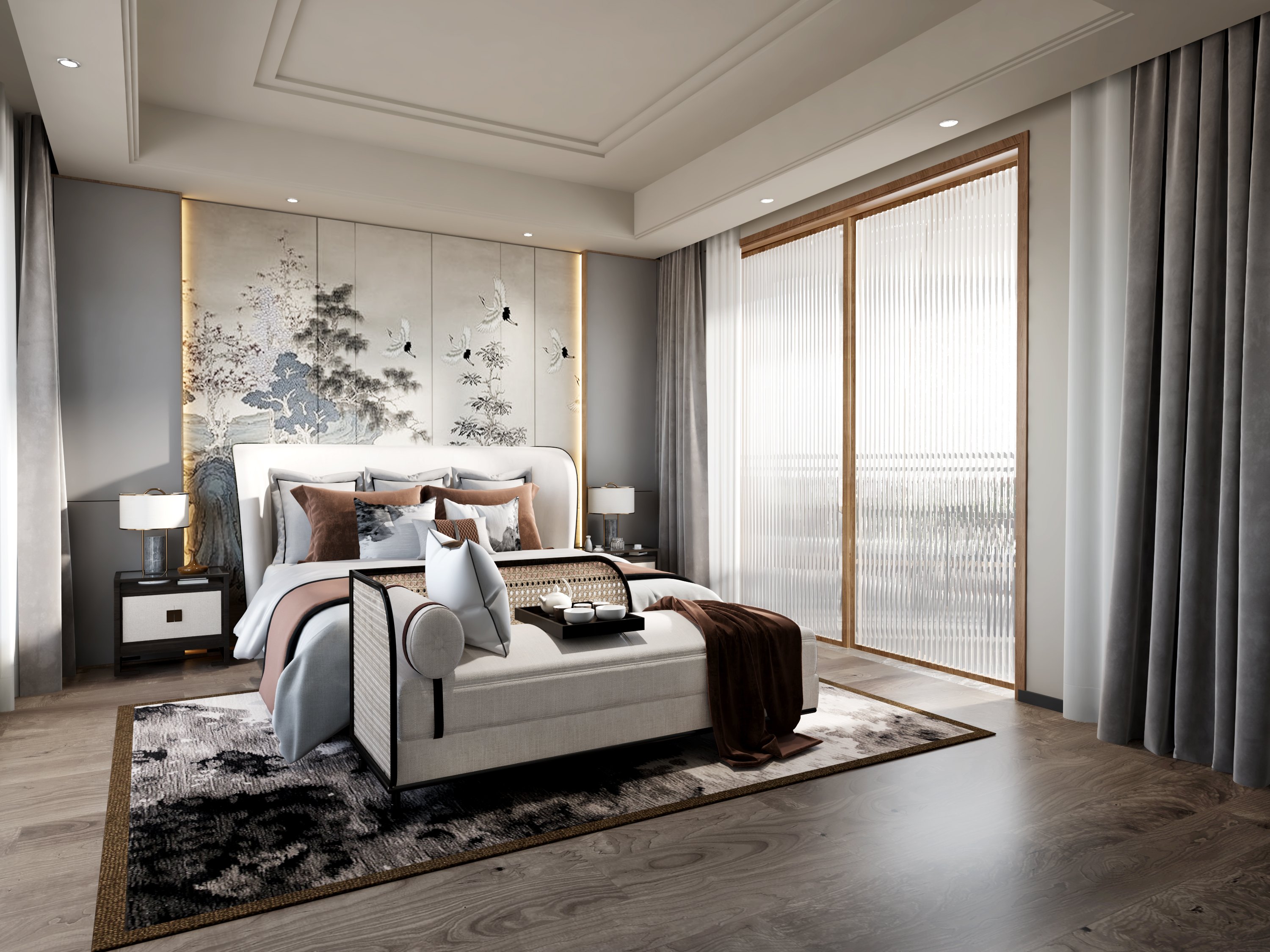 背景墙以水墨色打底,扇形元素做点缀,东方意境十足。温润的木质地板与水墨地毯营造出素雅的格调,呈现出最自然的生活状态。