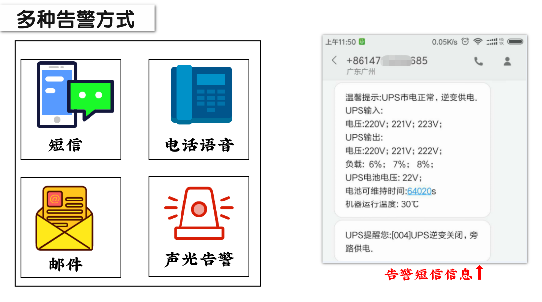 4.出现UPS断电、通讯中断、电池电压低等异常情况时,有本地声光蜂鸣告警提醒以及短信、电话语音的告警方式向管理员发出详细的告警提醒。