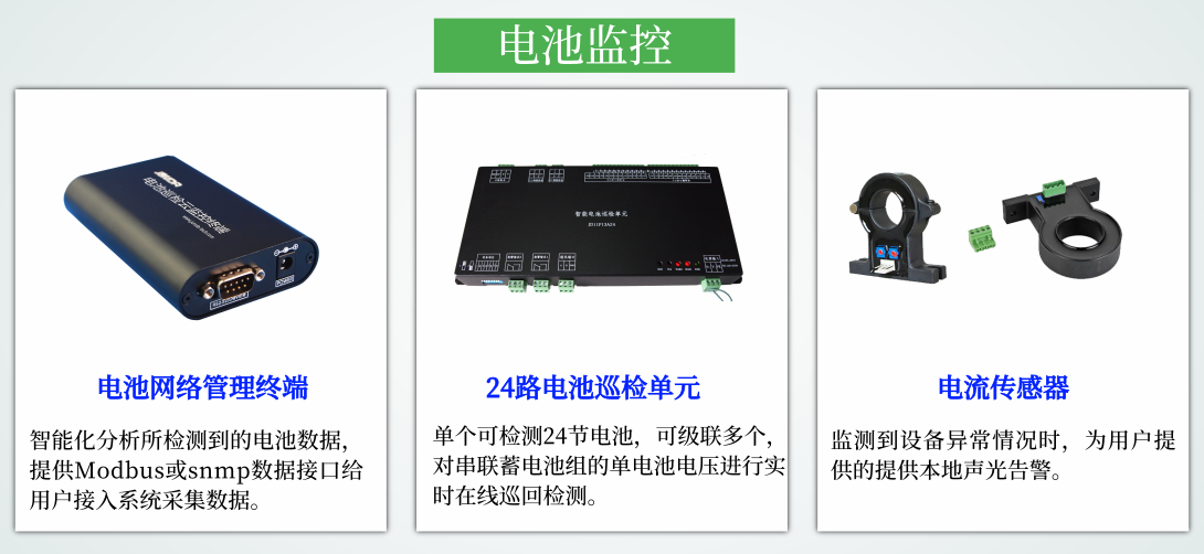 电池网络管理终端+24路电池巡检单元+电流传感器:对串联蓄电池组的单电池电压、蓄电池电流(充放电流分开检测,配电流传感器)进行实时在线巡回检测,并智能分析电池的使用状况,根据用户设置不同的上下限、平均偏差自动判断并输出告警。