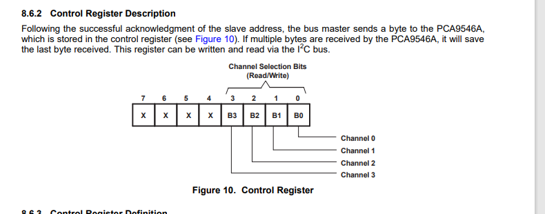 找到control register 描述部分,可以看到如果想要switch channel 2, 需要往该寄存器的bit 2置为1,也就是04h(这里由于没有地址冲突,其他channel也没接,所以我写了FF h,偷懒了)