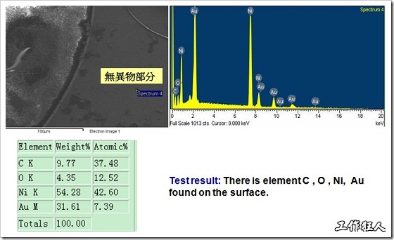 用EDX相對打了無異物沾污的地方,發現其成份有C(碳)、O(氧)、Ni(鎳)、Au(金),少了氯(Cl)的成份,這樣算正常吧。