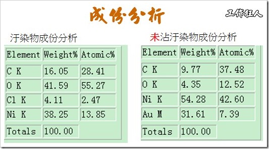 其實工作熊心理一直有個疑問,如果要將之歸罪為手汗漬引起的汙染,為何EDX打不到Na元素,汗漬污染應該是NaCl,綠色的汙染物或許可以被認定為NiCl2,一般來說鎳的鹽類大都呈現出綠色,如氧化鎳(NiO)、氫氧化鎳(Ni(OH)2)及氯化鎳(NiCl2)都會呈現出綠色的樣貌,我個人還是有點懷疑是浸金層沒有將鎳層覆蓋完全所造成,下回如果再碰到類似的問題可以來做切片看看其沾污處的鍍金層與鍍鎳層有無異常。氯(Cl)元素則可能是清洗板子所用到的鹽酸(HCl)殘留,躲藏在金層的瘤狀物之間,當然也不排除有助焊劑(Flux)污染。(個人意見啦!當然這是後來工作熊查詢了許多資料並詢問了公司以外的專家所產生的疑問)