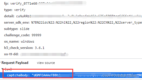 这年头学习都要跟唐僧似的,不然你都没法儿成正果。扯远了.....我们把注意力从大neinei转移到旁边的验证码上来,随便滑动一下会发现多了几个包,经过深度分析之后发现是c罩杯,啊不对,是 Y2FwdGNoYS92ZXJpZnk/bGFuZz16aA== 这个接口做的验证,对它提交的参数进行排查之后发现只有 captchaBody 这个参数没有找到来处,如图: