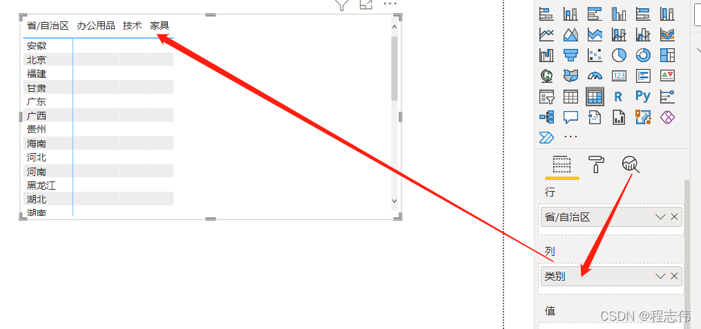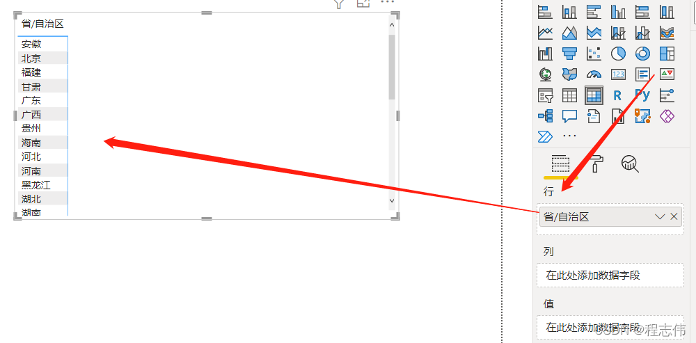 2.将省/自治区字段拖入到行中,矩阵中就会出现各个省情况,默认是按照拼音字母排序。