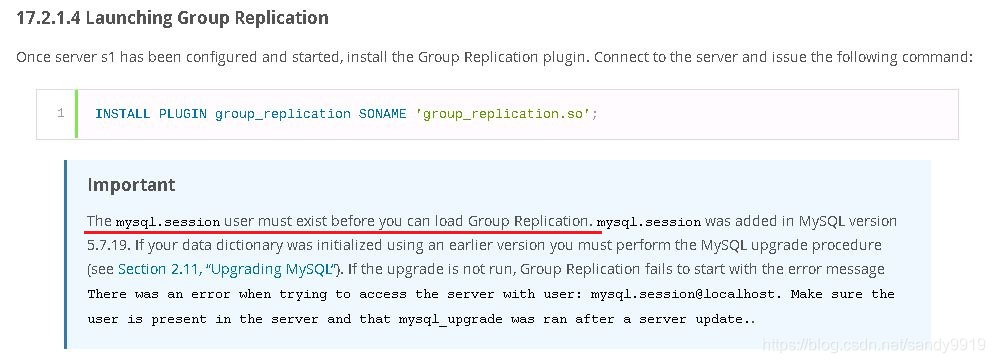 这样问题就明了啦!启用了“skip-name-resolve”参数后,mysql.session@localhost就失效了。但组复制插件安装的必要条件是创建mysql.session用户。参考《MySQL 5.7 Reference Manual --- 17.2.1.4 Launching Group Replication》