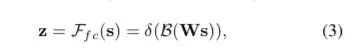 经过全连接生成紧凑的特征z(维度为d * 1), δ是RELU激活函数,B表示批标准化(BN),z的维度为卷积核的个数,W维度为d×C, d代表全连接后的特征维度,L在文中的值为32,r为压缩因子。