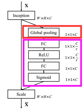 上图是SENet的Block单元,图中的Ftr是传统的卷积结构,X和U是Ftr的输入(C'xH'xW')和输出(CxHxW),这些都是以往结构中已存在的。