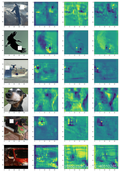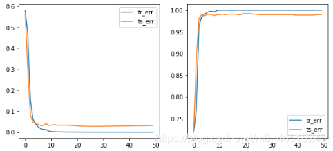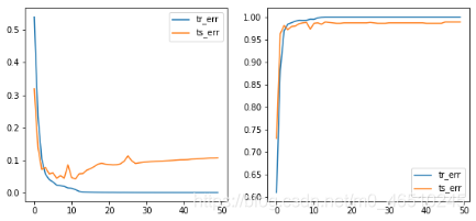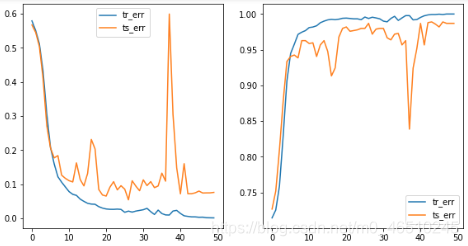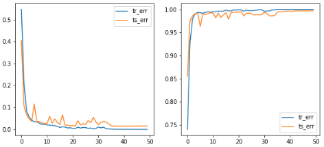 print(device)def plot_without_attention(tr_err, ts_err, tr_acc, ts_acc, img):plt.clf()fig, axs = plt.subplots(1, 4, figsize=(20, 5))axs[0].plot(tr_err, label='tr_err')axs[0].plot(ts_err, label='ts_err')axs[0].legend()axs[1].plot(tr_acc, label='tr_err')axs[1].plot(ts_acc, label='ts_err')axs[1].legend()axs[2].axis('off')axs[3].axis('off')display.clear_output(wait=True)display.display(plt.gcf())time.sleep(0.01)def plot_with_attention(tr_err, ts_err, tr_acc, ts_acc, img, att_out, no_images=6):plt.clf()fig, axs = plt.subplots(1+no_images, 4, figsize=(20, (no_images+1)*5))axs[0, 0].plot(tr_err, label='tr_err')axs[0, 0].plot(ts_err, label='ts_err')axs[0, 0].legend()axs[0, 1].plot(tr_acc, label='tr_err')axs[0, 1].plot(ts_acc, label='ts_err')axs[0, 1].legend()axs[0, 2].axis('off')axs[0, 3].axis('off')for img_no in range(6):im = img[img_no].cpu().detach().numpy().transpose(1, 2, 0)*0.5 + 0.5axs[img_no+1, 0].imshow(im)for i in range(3):att_out_img = att_out[img_no, i+1].cpu().detach().numpy()axs[img_no+1, i+1].imshow(att_out_img)display.clear_output(wait=True)display.display(plt.gcf())time.sleep(0.01)def train(model, att_flag=False):net = model.to(device)tr_err, ts_err = [], []tr_acc, ts_acc = [], []for epoch in range(50):errs, accs = [], []net.train()for i in range(4000//BATCH_SIZE):net.optim.zero_grad()x, y = getBatch(BATCH_SIZE, i*BATCH_SIZE)x = torch.FloatTensor(x).to(device)y = torch.FloatTensor(y).to(device)p, q = net.forward(x)loss = -torch.mean(y*torch.log(p+1e-8) + (1-y)*torch.log(1-p+1e-8))loss.backward()errs.append(loss.cpu().detach().item())pred = torch.round(p)accs.append(torch.sum(pred == y).cpu().detach().item()/BATCH_SIZE)net.optim.step() tr_err.append(np.mean(errs))tr_acc.append(np.mean(accs))errs, accs = [], []net.eval()for i in range(1000//BATCH_SIZE):x, y = getBatch(BATCH_SIZE, i*BATCH_SIZE+4000)x = torch.FloatTensor(x).to(device)y = torch.FloatTensor(y).to(device)p, q = net.forward(x) loss = -torch.mean(y*torch.log(p+1e-8) + (1-y)*torch.log(1-p+1e-8))errs.append(loss.cpu().detach().item())pred = torch.round(p)accs.append(torch.sum(pred == y).cpu().detach().item()/BATCH_SIZE)ts_err.append(np.mean(errs)) ts_acc.append(np.mean(accs))if att_flag == False:plot_without_attention(tr_err, ts_err, tr_acc, ts_acc, x[0])else:plot_with_attention(tr_err, ts_err, tr_acc, ts_acc, x, q)print(f'Min train error: {np.min(tr_err)}')print(f'Min test error: {np.min(ts_err)}')