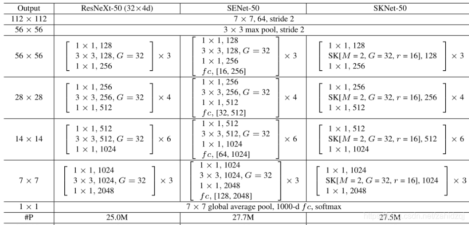 def SKNet50(nums_class=1000):return SKNet(nums_class,SKBlock,[3, 4, 6, 3]) # 论文通过[3, 4, 6, 3]搭配出SKNet50