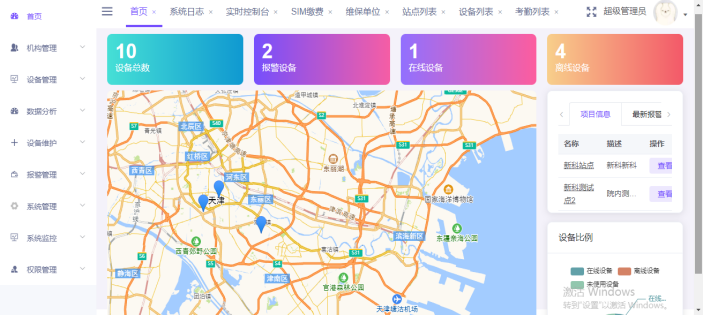 实时状态:查看该用户权限下,所有设备的实时状态。目前需要观察的设备。查看该账号下所涉及的所有设备的总体状态,例如:设备总数、在/离线设备比例、暂停设备数量、设备报警情况、设备比例与设备报警/故障排行等数据。
