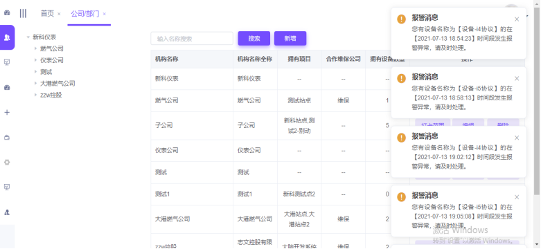 报警信息查看该用户权限下所有报警信息,新科方是全部项目报警信息,用户是自己项目的报警信息。报警信息包含:那个项目、那个设备、具体报警故障内容、设备编号等。首页总体显示报警信息。
