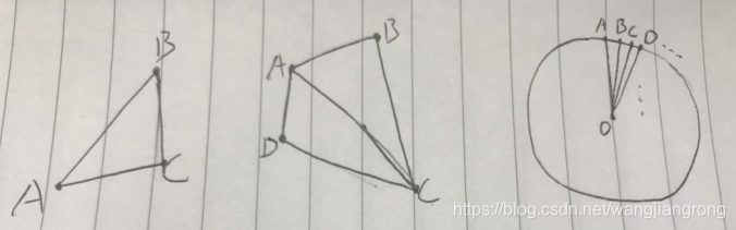 也就是说,Unity只能绘制出三角形,然后由一个个三角形来组成更复杂的形状。例如四边形是两个三角形组成(下图中是ABC和ADC两个三角形,当然也可以是ABD和BDC两个组成),五边形则是三个,而圆则可以由N个三角形组成,如下图: