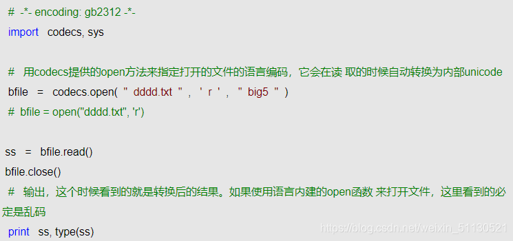 如果我们处理的文件里的字符编码是其他类型的呢?这个读取进行做处理也需要特 殊的处理的。codecs也提供了方法.
