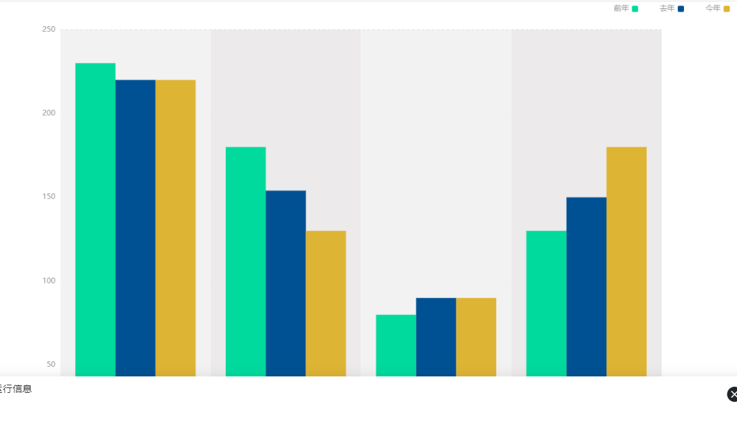 option = {color: ['#00da9c', '#005193', '#deb434', '#5fb878', '#ffb980', '#d87a80', '#23c6c8'],tooltip: {trigger: 'axis',axisPointer: {type: 'shadow',},},grid: {//控制整体布局left: '10%',right: '10%',bottom: '15%',top: '5%',containLabel: true,},legend: {data: ['前年', '去年', '今年', '平均'],align: 'right',right: 10,textStyle: {color: '#999999',},itemWidth: 10,itemHeight: 10,itemGap: 35,},xAxis: {type: 'category',data: ['10月', '11月', '12月', '1月'],splitLine: {show: false,},axisLine: {lineStyle: {color: '#DFE3E9', // x轴颜色width: 1, // 粗细},},axisLabel: {color: '#999999', // x轴刻度名称颜色interval: 0, //代表显示所有x轴标签显示rotate: 45, //代表逆时针旋转45度},splitArea: {show: true,interval: 0,areaStyle: {color: ['#f3f2f2', '#eceaea'],},},},yAxis: [{type: 'value',axisLabel: {color: '#999999', // y轴刻度名称颜色},splitLine: {show: true,lineStyle: {type: 'dashed',},},axisTick: {//y轴刻度线show: false,},axisLine: {//y轴show: false,},},],series: [{name: '前年',type: 'bar',barGap: 0,// barWidth : 30,//柱图宽度barMaxWidth:30,//最大宽度data: [230, 180, 80, 130],},{name: '去年',type: 'bar',barGap: 0,data: [220, 154, 90, 150],},{name: '今年',type: 'bar',barGap: 0,data: [220, 130, 90, 180],},],