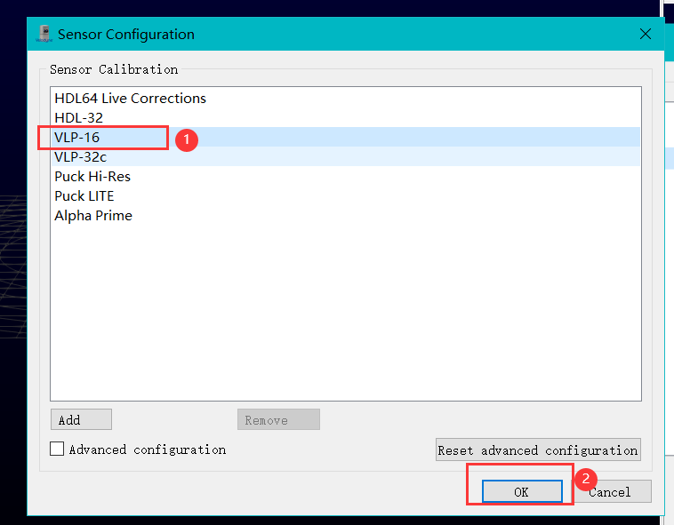 2、在弹出的界面,选择所对应的激光雷达按型号,点击OK ,这里选择16线激光雷达。