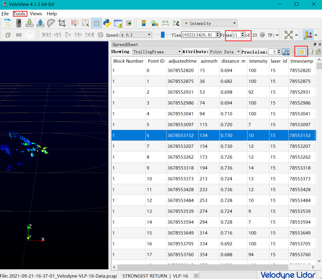 Veloview软件好用的原因就是可以直接将点云数据保存为CSV格式,非常方便,包括三维位置和属性数据,X、Y、Z数据值和时间戳。