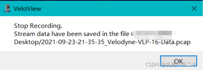 如果想录制某一段点云数据,点击上方红色按钮,选择保存位置,再次点击按钮,提示已经录制成功,文件格式为.pcap