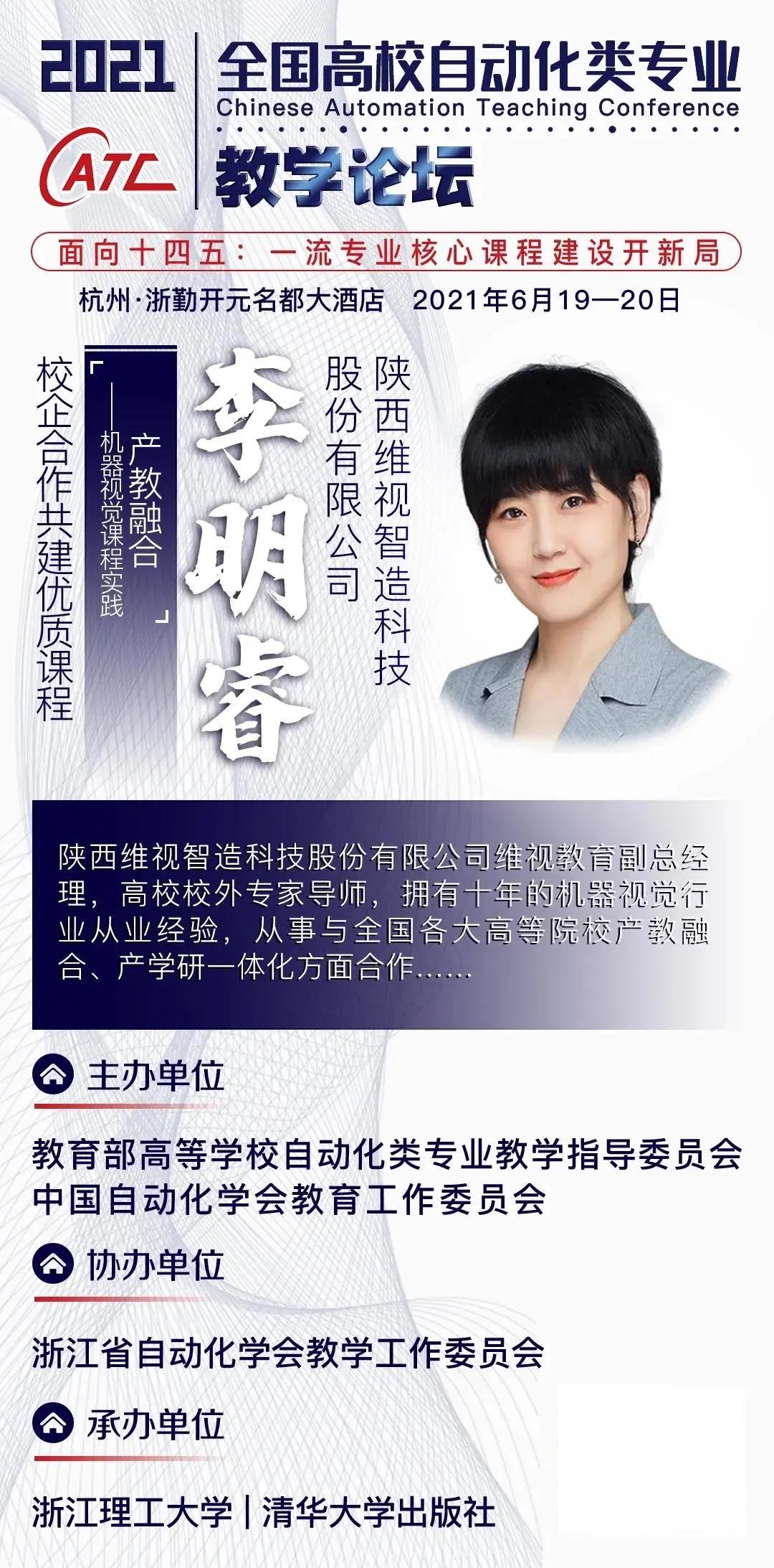 本次2021全国高校自动化类专业教学论坛将于6月19日-20日在杭州浙勤开元名都大酒店举行,维视集团旗下子公司维视教育科技股份有限公司(以下简称“维视教育”)李明睿副总受邀参与此次论坛分享,发表“新工科专业背景下的机器视觉实践课程”的主题演讲。