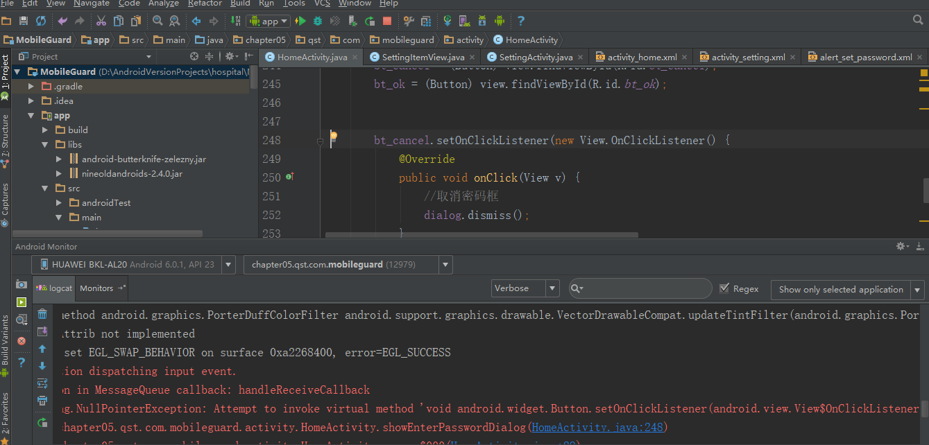281 12851-12851/chapter05.qst.com.mobileguard E/MessageQueue-JNI: java.lang.NullPointerException: Attempt to invoke virtual method 'void android.widget.Button.setOnClickListener(android.view.View$OnClickListener)' on a null object reference