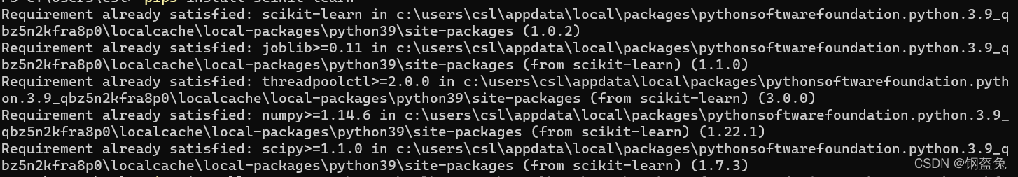 其实仔细观察报错,他的大概意思是要求你都已经满足了,也就是可能这个库,你已经在这个环境下安装好了,使用我直接在Python下敲import sklearn,发现还真的安装好了