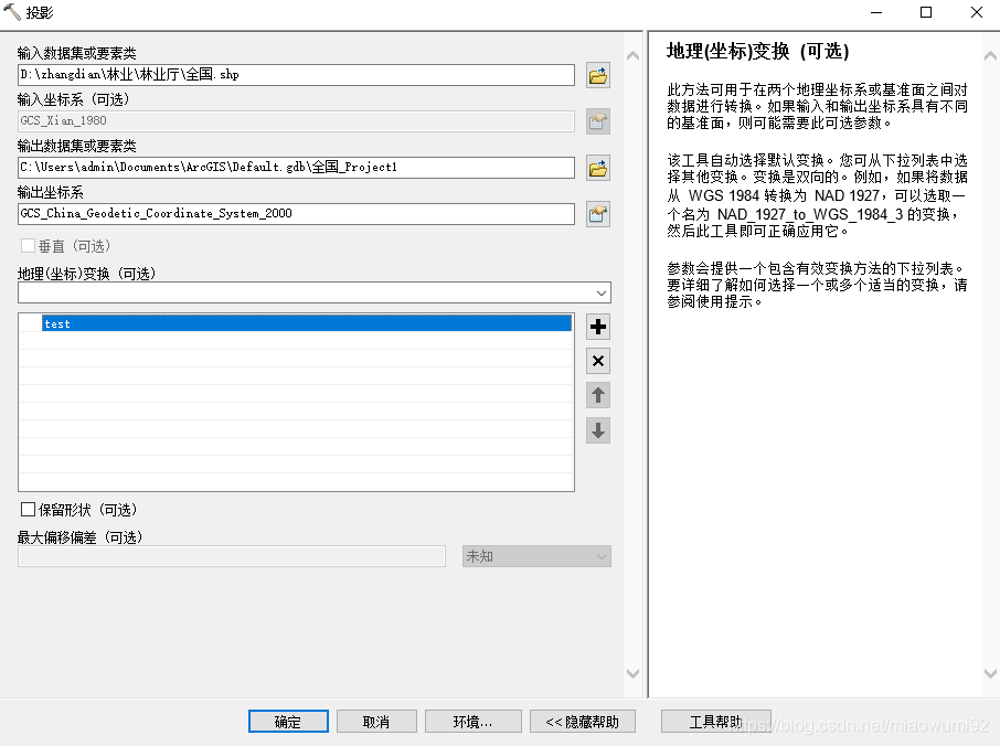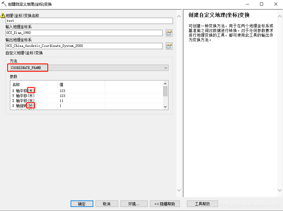 1.打开“创建自定义地理(坐标)变换”工具,进行设置。