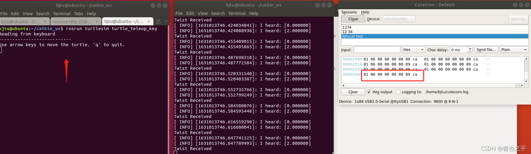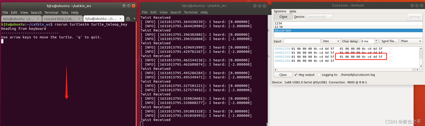 在键盘输入的终端,分别输入方向按键,可以监控到串口出不同的刹车指令。