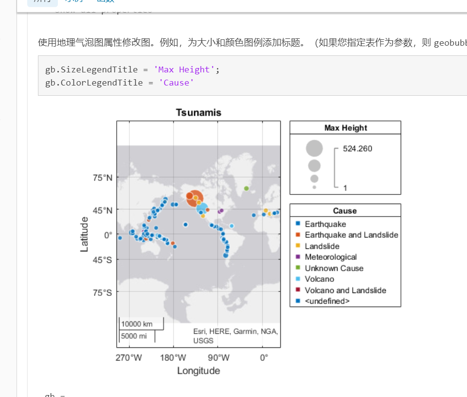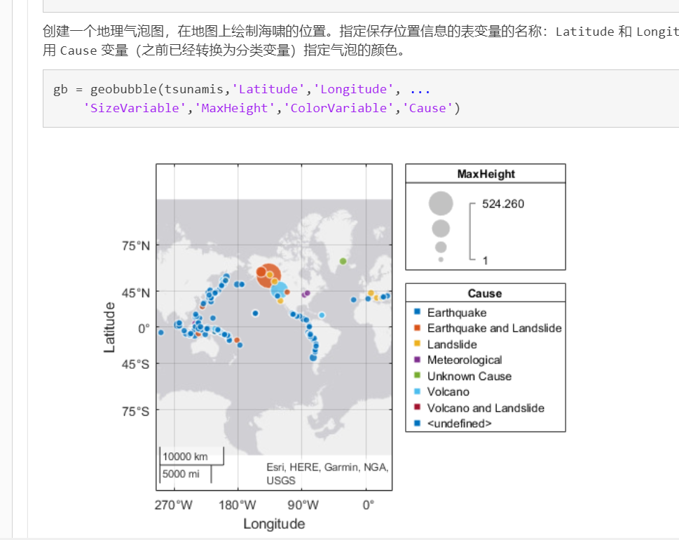 1. geobubble(text,lat,lon,'SizeVariable','part3','ColorVariable','part4') 第一个变量填text,之后写text里面对应部分