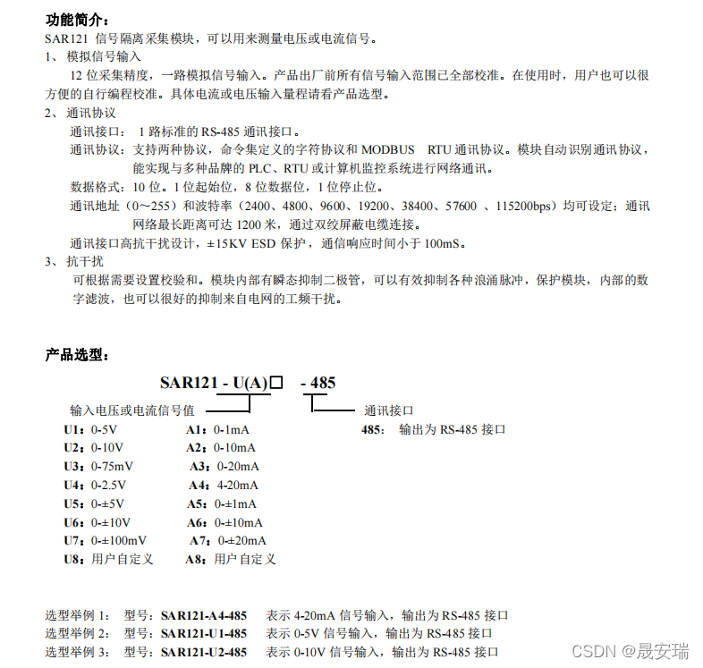 产品包括电源隔离,信号隔离、线性化,A/D转换和RS-485串行通信。每个串口可接255只 SAR121系列模块,通讯方式采用ASCII码通讯协议或MODBUS RTU通讯协议,波特率可由代码设置,能与其他厂家的控制模块挂在同一RS-485总线上,便于计算机编程。