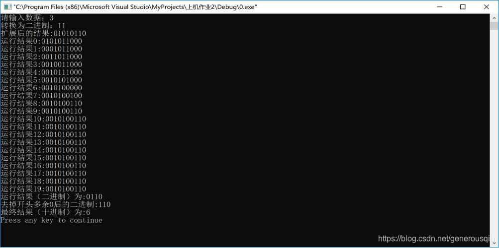 (3)最后,将运行结果收缩为二进制,将字符串中的“0110”清空;将“01”用“1”替代,“0”保持不变,然后在调用transformatin1()将二进制转换为十进制。